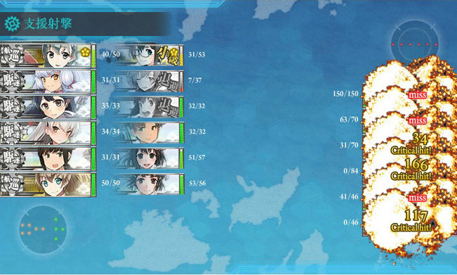 2隻の退避艦が出ても、決戦支援艦隊がこのように活躍してくれればボス戦はこっちのものです。支援艦隊は高速戦艦2隻・軽空母2隻・駆逐艦2隻の重めの編成。資源にはかなり余裕があるのでこういう所はケチりません。