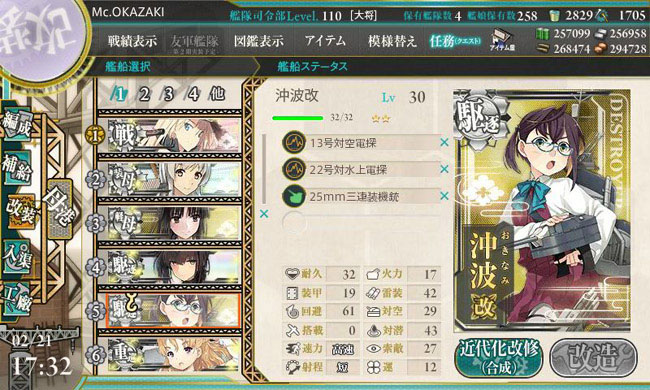 冬イベで入手した新艦娘も続々改装レベルを迎えています。まずは沖波、Lv.30で改装可能です。最近の駆逐艦にしてはかなり低めの設定ですね。