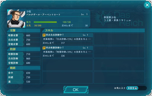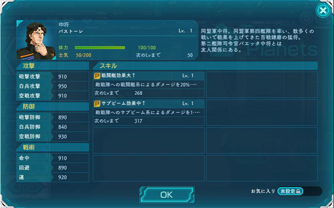 しかし前線指揮官としては凡庸だったはずですが・・・何だこの能力値は!前述のパストーレ中将と比べると明らかですが、攻防ともに非常に優秀な人材となっています。