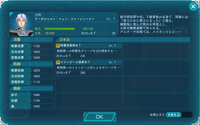 ・・・の割には、能力値は思った程高くないですな。キャゼルヌの方が前線指揮官として優秀ってのはちょっとおかしいような。