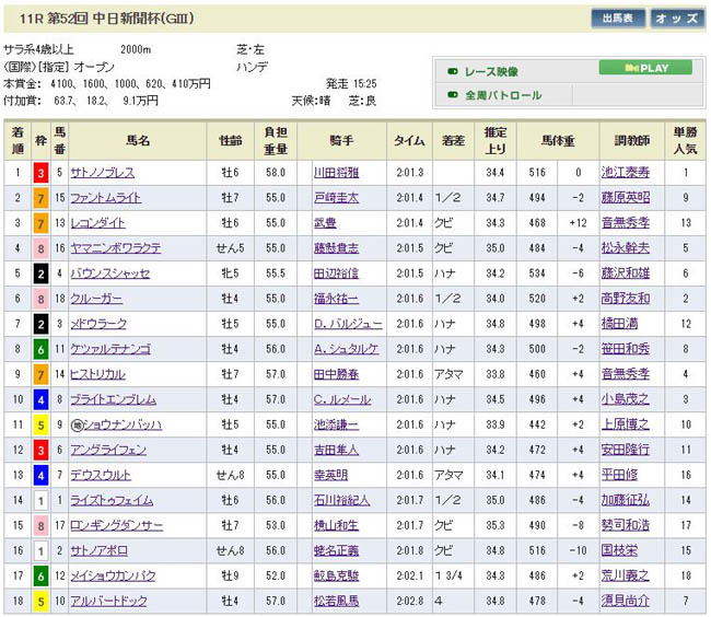 そんな中、◎はサトノノブレスを指名(最終的に単勝5.6倍で1番人気になりましたね)。中京芝2000mはGUの金鯱賞で2着1回、3着1回と得意にしていますし、いかにもこの条件を走りそうな父ディープインパクト×母父トニービンの血統。枠もインの良い所を引きましたし、好調の川田騎手が鞍上ならば少なくても3着は確保しそうです。