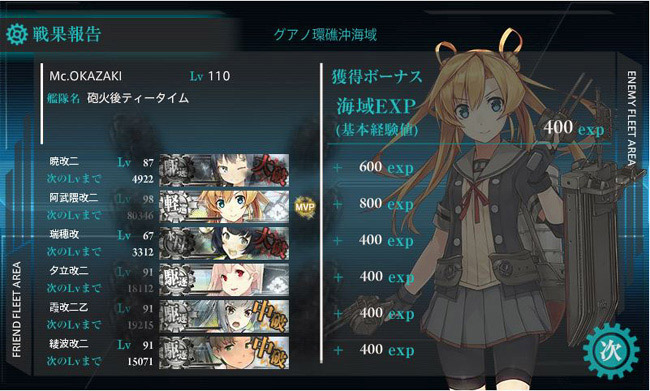 こうして遂に6-3海域、無事攻略です。編成は駆逐艦4隻+軽巡1隻+水上機母艦1隻。駆逐艦はLv.90クラスの改二艦を惜しみ無く投入し、軽巡は先制雷撃の出来る阿武隈一択で。水上機母艦はLv.67の瑞穂でも十分戦力になりました。