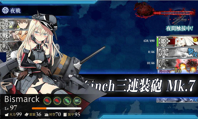 しかしラスダンとなるとそうも言ってられません。装甲空母(今月は大鳳と翔鶴改二を投入)に大和型の2隻、航空戦艦の扶桑、デコイ兼先制雷撃要員の伊401(ダメコン搭載)、そして今月はビスマルクもこのメンバーに参戦です。アイオワ砲の命中率の高さが戦局の推移に一役買っています。