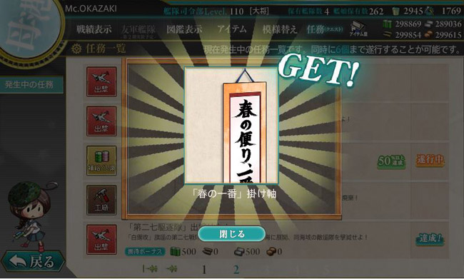 アプデでは新海域の6-4や水上戦闘機の実装等が話題となっていますが、地味に第27駆逐隊任務も実装され、突破した提督には白露謹製の「春の便り」掛け軸が貰えます。普段から満遍なくレベルを上げているので、第27駆逐隊の面々も当然実戦レベル(時雨:Lv.91、白露・時雨・春雨:Lv.62)なので問題なく一発突破です(羅針盤も味方しました)。