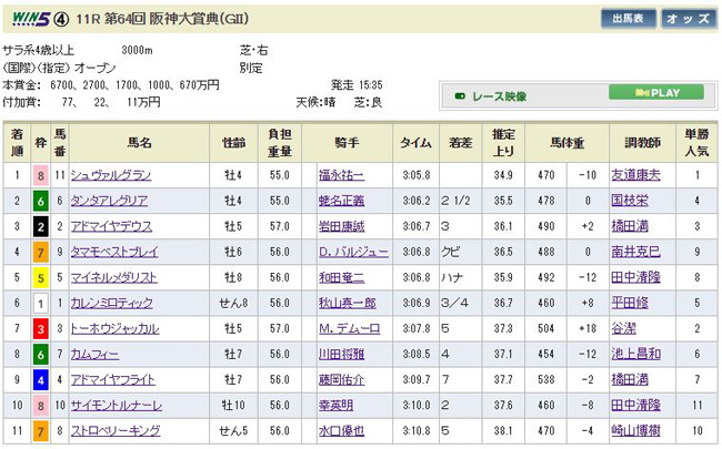 ヴィルシーナの弟で大魔神佐々木主浩オーナーのシュヴァルグランが初重賞戴冠!さぁ、次は天皇賞(春)ですな!2着にタンタアレグリア・・・この馬、重賞は勝てないまま有力ステイヤーに育って行くんだろうか?3着に不振の岩田がようやく馬券に絡んでくれて、三連複は本線で大的中!そして不安のあったトーホウジャッカルは裏ネタ通り7着に沈み・・・危ない危ない、裏ネタが無かったら普通に本命にしていたかもしれん。