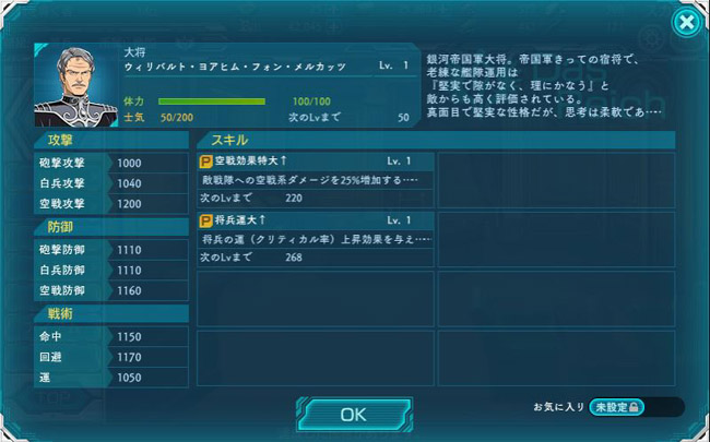 能力値は・・・うーん、もっと高くてもいいだろ?と言わざるを得ません。肩書が大将なので、同盟に亡命する前の能力値なのでしょうが・・・同盟軍キャラとしてのメルカッツはもっと能力値が高いのかな?
