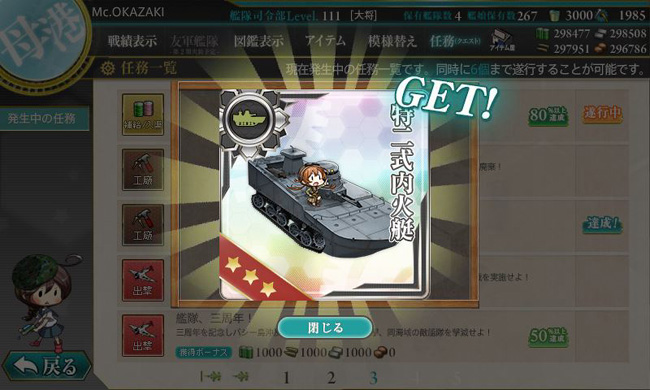 それと、今回のアプデで新実装された任務をクリアして行くと、新装備として話題になったカミ車こと特二式内火艇を入手する事が出来ます。いや、イベント前かイベント報酬でバラ撒きされるんじゃ・・・と思っていたので、無理に八九式中戦車付大発の改装をしないで正解でした。