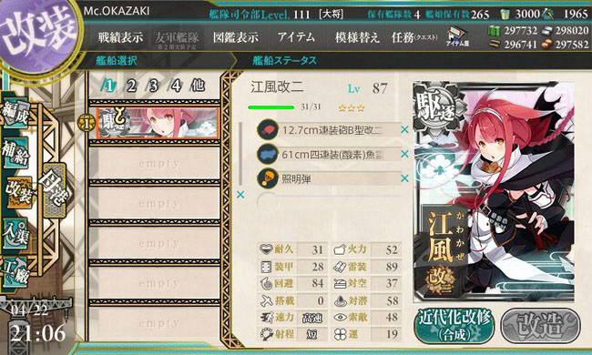 改装はLv.75で可能。ウチはLv.87まで育てていたので無問題でした。初期装備は夕立砲に四連装酸素魚雷、それに照明弾。夜戦で活躍した事もあって、やはり夜戦装備を持って来ました。