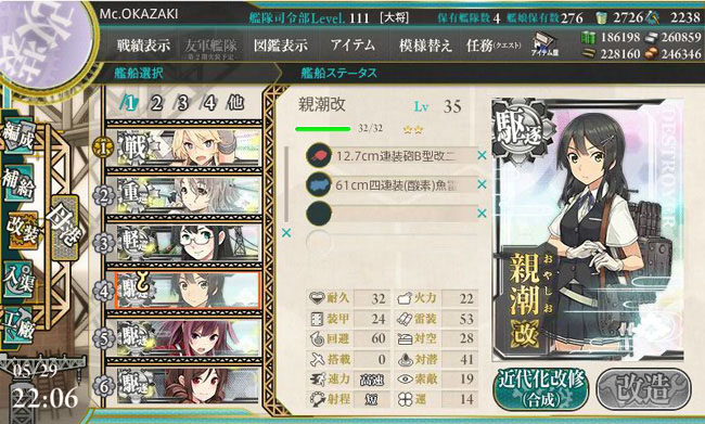 E-7で掘り当てた親潮も早くも改装完了。こちらはLv.35と、最近の新規艦娘の中ではまだマシなレベル設定です。
