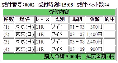 馬券は・・・ここはロサギガンティアからのワイドで4点流し。あわよくば2点獲りを狙います。荒れるGTなので、ヘンな馬が突っ込んで来ても1点獲りは確保しよう、と。