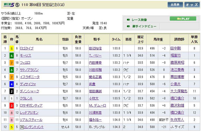 勝ったのはなんとロゴタイプ!田辺騎手が逃げて人気薄を残らせるのは、実は昨年のこのレースでもクラレントで見せた得意技。しかし今回はこの馬で勝たせる所まで昇華させるとは。