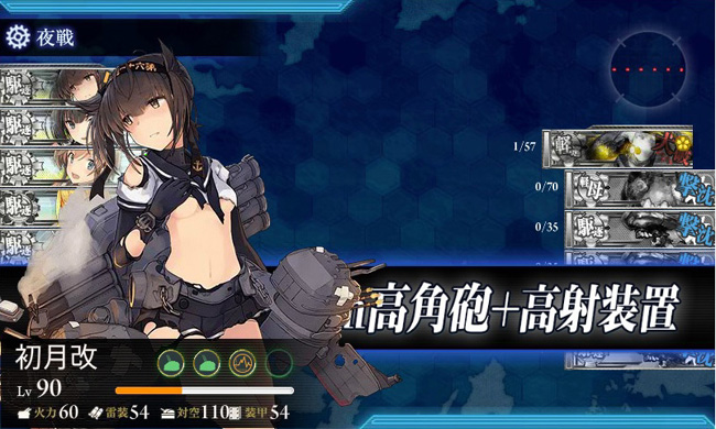 今月は順番をちょっと入れ替えて2-5の次に1-6をクリアしています(新任務で1-6を攻略する物があったので)。秋月型三姉妹はここでは主力です。春イベとアイオワ改の装備でボフォース40_四連装機銃を2つ入手したので、これらを搭載した秋月型は更に対空火力が増しています。
