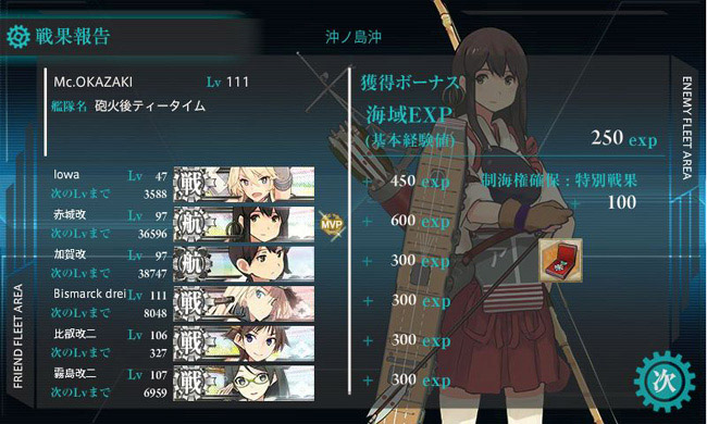第五戦隊任務をこなした後は正規空母4+高速戦艦2で突破。同じ海外の高速戦艦という事で、アイオワは今後ビスマルクとのコンビが増えそうです。