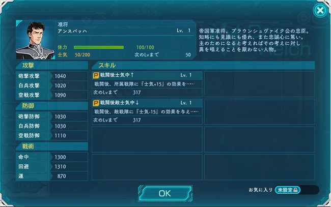 提督の数が上限の50人に達してしまったので、最近はゲームオリジナルキャラで能力や階級の低い面子は首切りを行っています。この彼も長い命じゃなさそうですw
