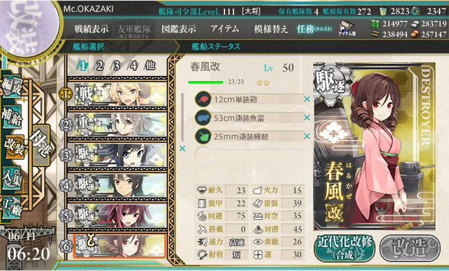 そして春風もLv.50に達して改装完了・・・こちらはアイオワとは異なり、ここまでのレベリングに非常に苦労しました。何しろ神風同様に火力も装甲も無い旧式の駆逐艦の上、Lv.50までは2スロで耐えなくてはいけませんからねぇ。