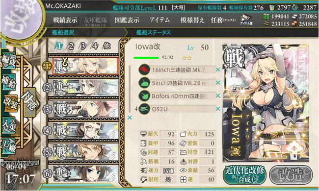 春イベ最終海域の突破報酬だったアイオワも改装レベルに達しました。Lv.50と決して短い道程ではありませんでしたが、ともかく使い勝手が良い上に優先的に旗艦として使っていたので、レベルはめきめき上がって行きました。