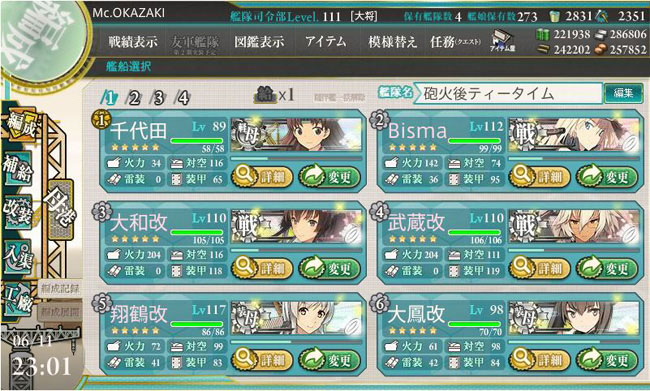 攻略はいわゆる軽空母ルートで。戦艦は惜しまずに大和・武蔵・ビスマルク。空母も制空専門の千代田の他には、装甲空母の翔鶴改二と大鳳を投入。更に要となる支援艦隊は道中・決戦とも最強クラスを投入。これで・・・行けるか?