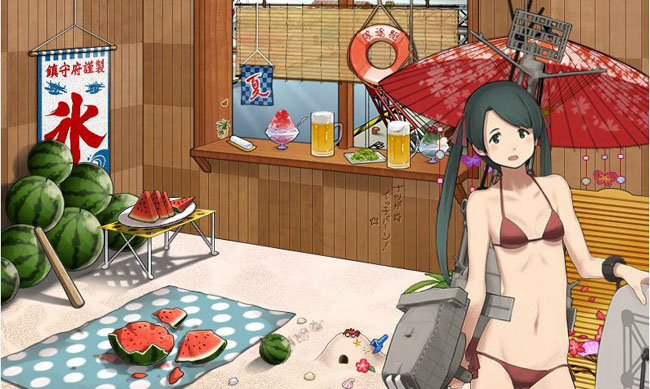 そして衝撃的だったのがこの三隈のビキニ・・・布面積ちいさ!凹凸やくびれのない、見事なまでの日本人幼児体型!なんつーか、こう見てはいけない物を見てしまったような・・・それに、何か顔が雑コラっぽくも見えたりw
