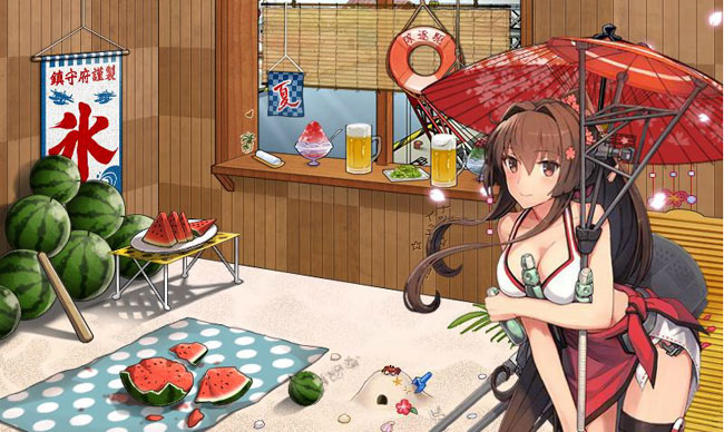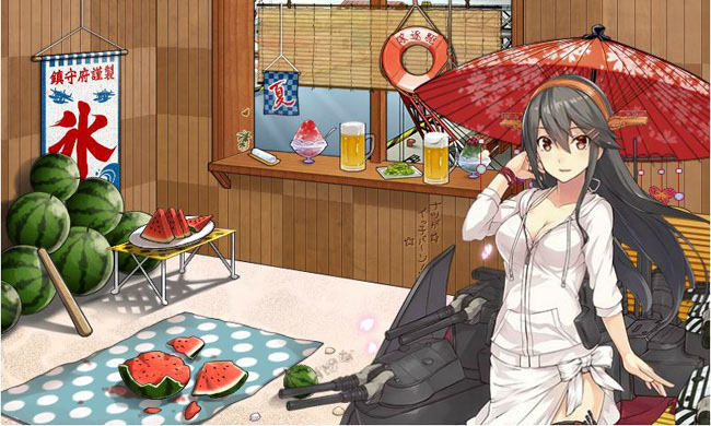 続いては榛名。水着・・・とは言えない夏のリゾート着のような感じの衣装です(でも中破するとちゃんと水着)。榛名の恥じらいを感じさせる、キャラの特性をよく分かったグラです。