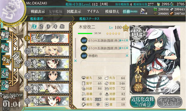運があまり高くないので、イベント時の北上様のような活躍を望むのは酷ですが、それでも貴重な重雷装巡洋艦として各所で使い続けて来た結果のケッコンカッコカリです。これからも一線級の貴重な戦力です。