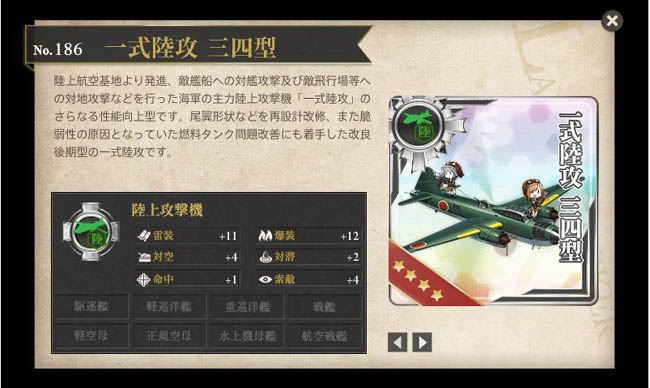 スペックは完全に一式陸攻の上位互換。一式陸攻野中隊に匹敵する高性能陸上爆撃機です。史実では初期型(一一型)よりも装甲を増やした分、航続距離が落ちたはずなのですが、艦これの三四型はそんな事はないみたいです。