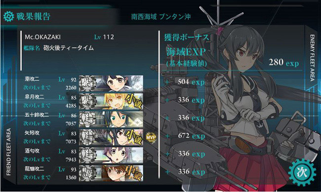 戦闘自体は楽勝だったものの、何しろ掘りの回数が多かったので参加した艦娘はそれぞれレベルが2つ3つほど上がりました。これまであまり日の目を見る事が無かった潮や阿賀野姉妹に活躍の場を与えられたのが良かったですかね。
