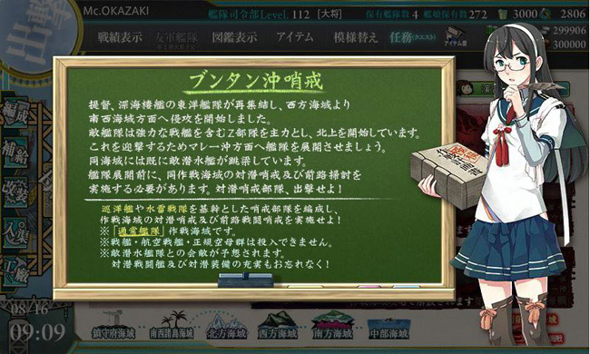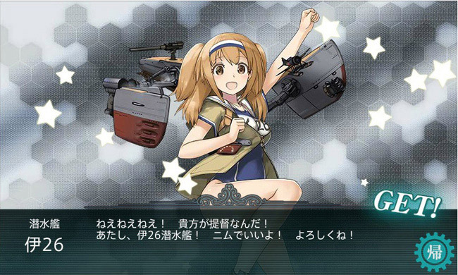 伊26を掘り当てたので、これで安心して本来の攻略である甲作戦に難易度を上げます。つーか、先制爆雷攻撃艦が5隻いる今回の攻略編成は、丙作戦では完全にオーバーキルでしてw 掘りの時の戦闘結果は、95%がノーダメージの完全勝利、残り5%がカスダメのみのS勝利でしたので、攻略自体は甲作戦でも何ら不安はありません。