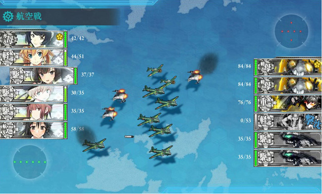 Iマスの攻防。一式陸攻が軽空母群に襲い掛かり、敵機を秋月が対空カットインで叩き落とす。うん、これがイベントの戦いだよな!