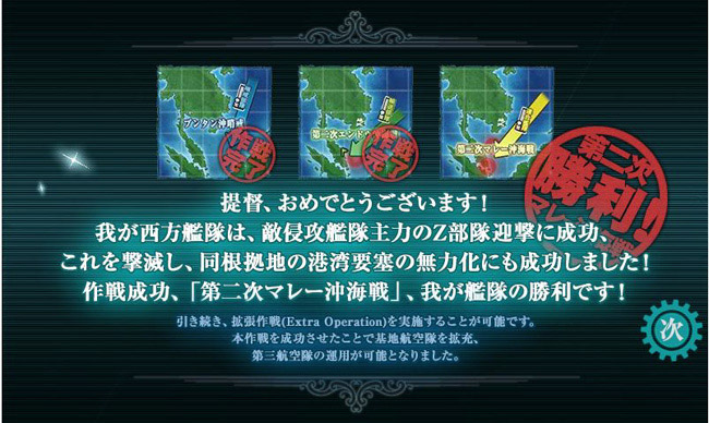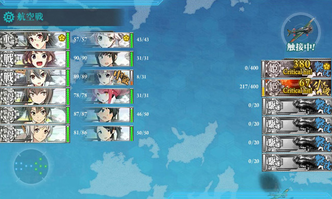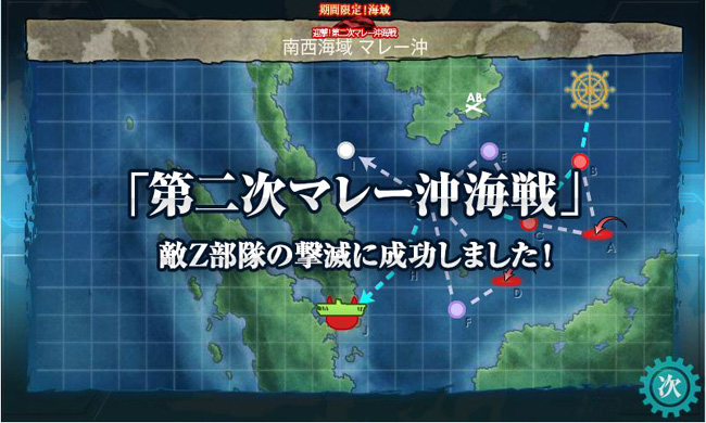 道中最大の脅威となるZ部隊ですが、開幕爆撃と基地航空隊の攻撃が上手くハマれば、砲撃戦の前にこのようにほぼ無力化する事も可能です(まぁ丙ですし)。