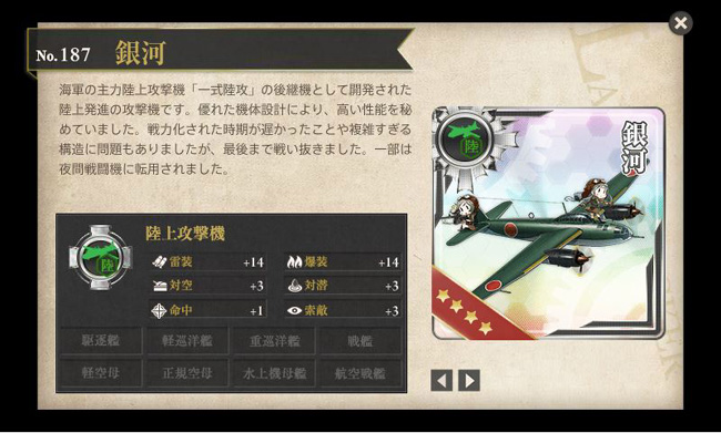 そして甲作戦でのみ入手可能なのが、この高速陸上爆撃機・銀河!これこれ、これが欲しくて甲で頑張ったんです!