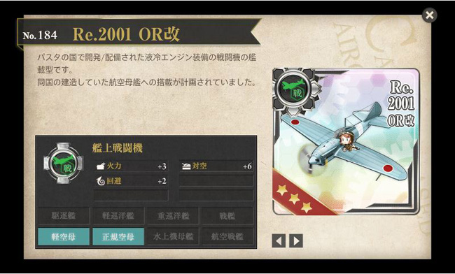 持って来る艦載機もこれまた微妙・・・。火力+3が付くのは貴重ですが、対空+6ではちょっと制空戦での出番は無さそうです。イタリア空軍機なので航続距離も短いです。