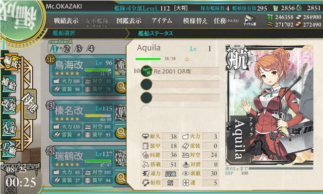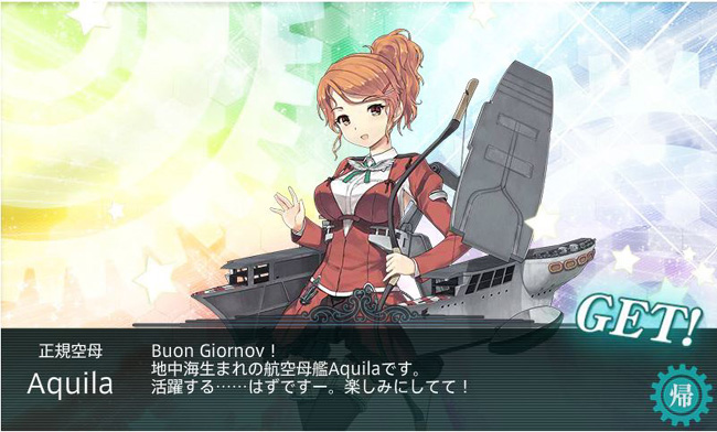 散々苦労して入手したアクィラですが・・・うん、弱いw こりゃ正規空母の皮を被った軽空母ですな。まずは改にしてなんぼですが、当面は演習の随伴が役目になりそうですね。