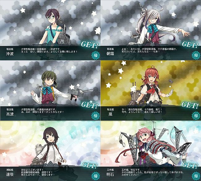 それでもここは本当にレア艦の宝庫でした。これまで入手に散々苦労させられた艦娘たちが、面白いようにポンポン掘れます。特に嬉しかったのが2隻目の明石ですね(確率0.69%のドロップを引き当てました!)。この明石を改装すれば新たに2つの修理施設が入手出来、初代の明石を修理施設×4装備のパーフェクト明石にする事が出来ます!