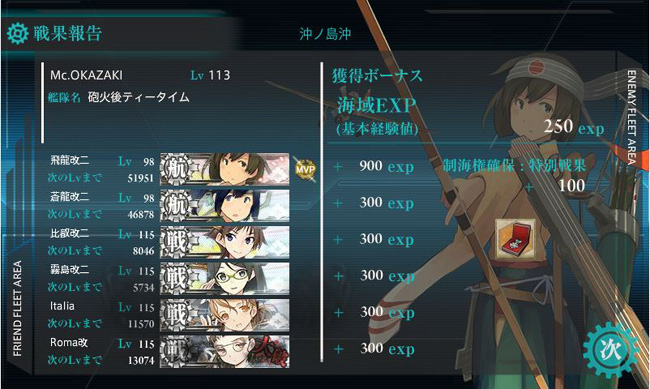 第五戦隊の任務を終えた後はいつもの高速戦艦4隻・正規空母2隻に編成変更。夏イベでルート固定艦として金剛と榛名がLv.117まで成長したので、追い着かせるべく比叡と霧島を優先的に使っています。