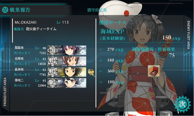 まずは1-5。先制対潜攻撃の実装で難易度が一気に下がったこの海域、今月は「先制対潜攻撃が出来る浴衣実装艦」を優先的に使おうと、軽巡枠は長良・名取・球磨・多摩をローテーションさせました。夏イベE-1でも活躍した潮は、ここでも先制対潜攻撃可能な数少ない駆逐艦として頑張って貰ってます。