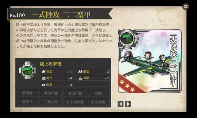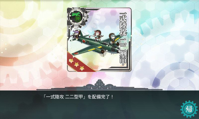 性能はノーマル一式陸攻の上位互換で、先日実装された三四型の下位互換。まぁ優秀な陸攻である事は変わりないので、次のイベント時にはしっかり活躍してもらいましょう。