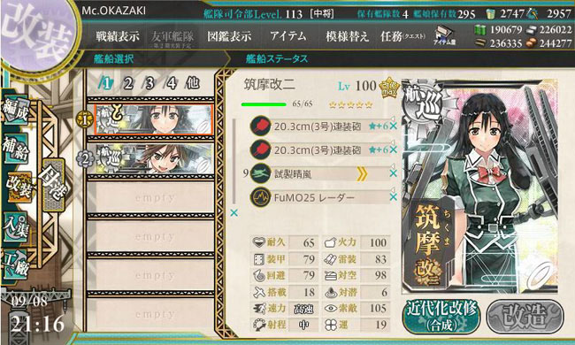 史実でも利根の影に隠れがちな所がありましたが(幸運艦・不幸艦の姉妹という点では少し五航戦に似てます)、太平洋戦争の主要な機動部隊決戦には殆ど参加している武勲艦です。ゲームでも早く姉の利根のレベルに追い着くよう、優先的に使って行きたいと思います。