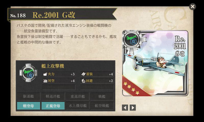 新装備で持って来る艦攻は・・・うーん、これはちょっと使い難いなぁ(^_^; つーか解説文の歯切れの悪いこと悪いことw アクィラには普通に烈風系や流星系を乗せましょう。