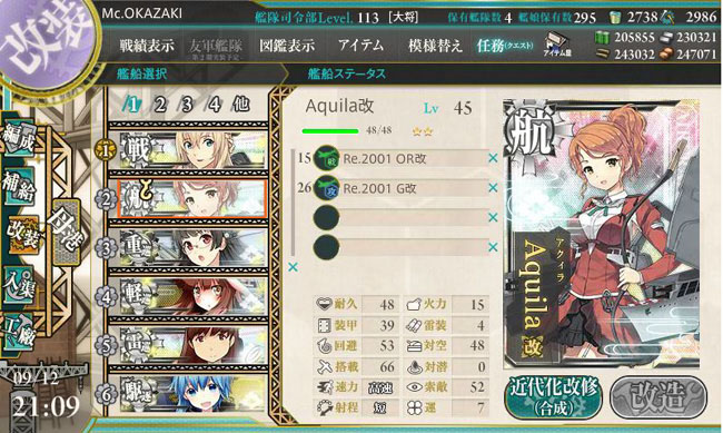 あと、アクィラがLv.45に到達して第一次改装を行っています。演習艦隊で烈風と彩雲を満載して、地味に制空戦で活躍して来た結果です。