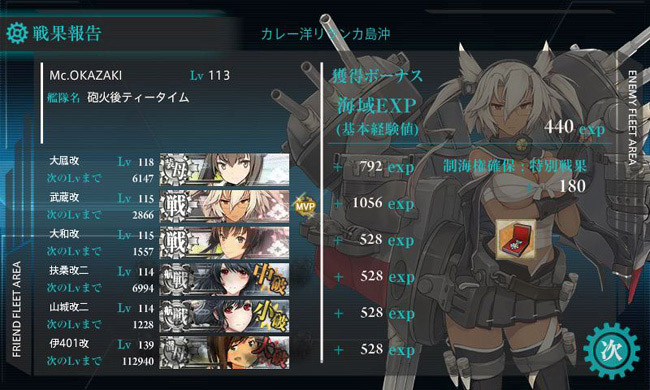 相変わらず中央ルートへの逸れや道中大破は頻発しましたが、今月も何とか海域突破。大破しながらMVPを獲って勲章を持ち帰ってきた筑摩・・・姉共々可愛がってあげないといけませんねグヘヘ❤(ゲスの極み提督)
