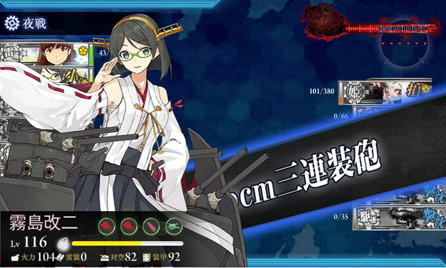 さて、最難関月次EO海域とも言われる4-5。削り段階では大井・霧島・足柄&他の妙高型から1隻・飛龍・蒼龍という編成で進軍。この編成も夏イベが微妙に影響してまして、大井は「夏イベで成長した北上に追い着かせるため」、霧島も「夏イベで成長した金剛・榛名に追い着かせるため」、妙高型は夏イベで出番が無かったため(特に足柄は第五戦隊任務からも外れるので成長が少し遅れていた)、ニ航戦は・・・まぁ正規空母では一番使い易いんですよねw