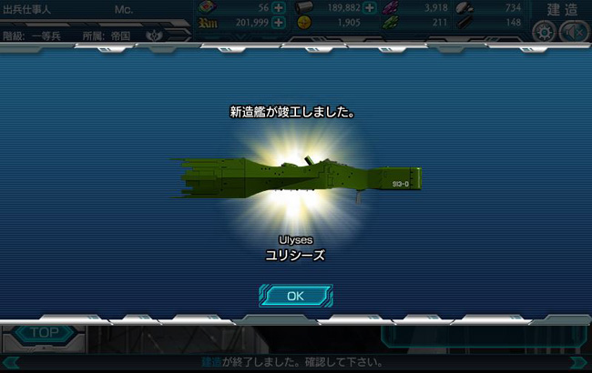 やっとこいつが出ました、同盟軍戦艦ユリシーズ!特別レア艦って訳じゃないんですが、なかなか出なかったんですよ。