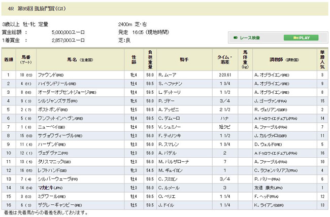 ムーア強し!やはり世界最強騎手はこの男です。ファウンドが5戦目の正直で凱旋門賞制覇。ムーアは2年連続凱旋門賞勝利・・・すげー!