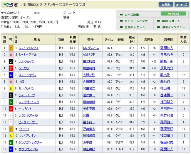 勝ったのは鋭く差して来たデムーロのレッドファルクス。ミッキーアイルは逃げ粘ってのアタマ差2着で松山騎手の初GTタイトルはお預け(好きな騎手なので応援してます)。3着は中山得意の田辺騎手が3歳牝馬のソルヴェイグをリード。以下、やはり1200m戦では光る素材のシュウジ、0.1秒差5着と完全復活のスノードラゴンまでが掲示板に乗りました。