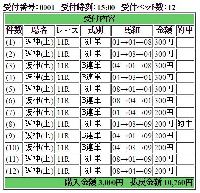 今年は11頭立てと少頭数ながら、有力な上がり馬が名を連ねてなかなか面白い面子となってます。まぁここは人気上位拮抗かな・・・と。1・2・3番人気馬の三連単BOXと、3着はありそうな4番人気のアポロケンタッキーの3着付けで勝負です。うーん、シンプル。