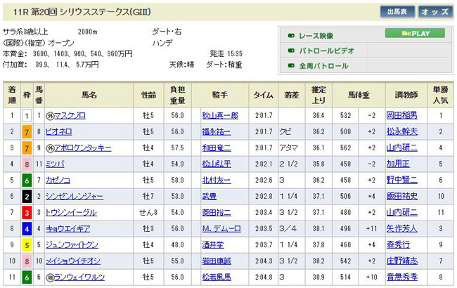 やはり上位拮抗。1着は前走圧勝の波に乗ったマスクゾロが重賞初勝利。秋山真一郎は1年半ぶりの重賞勝利ですね。2着にこれまた人気のピオネロ。3着には先行馬を粘らせるのに定評のある和田騎手のアポロケンタッキー。人気馬ではキョウエイギアが直線で潰れて惨敗したものの、まずは狙い通りの結果です。うむ、これでスプリンターズステークスと凱旋門賞の勢いが着いたぞ!