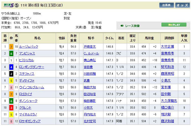 ようやく目覚める怪物の遺伝子!ルージュバックが並み居る強豪古馬を蹴散らして堂々秋の主役に名乗りを上げました。2着にやはりこの距離は走るアンビシャス。しかし3着にブービー番人気のヒストリカル、4着にビリ人気のロンギングダンサーってのは全く読めません・・・。他の有力馬は5着以降に固まった感じです。先行馬が壊滅し、追い込み勢が前を食った典型的なレースでした。