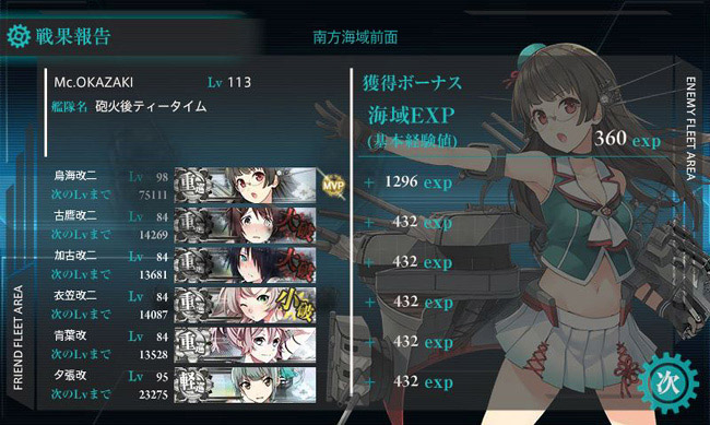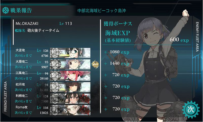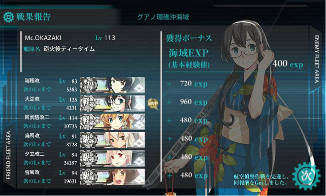 ずっと旗艦で奮戦した大淀はLv.126に成長。秋月型も全艦Lv.94になりました。ほぼ1日掛けての長い戦いの末の突破です。