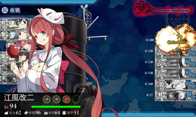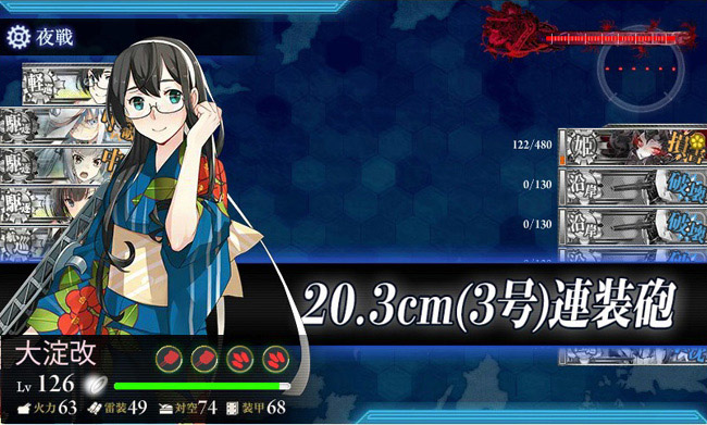 大淀以外はローテーションを組んで常にキラ付けされた艦隊を展開するようにして、ようやく6-4ボスを攻略!これ、基地航空隊の支援が無かったら突破出来なかったんじゃ・・・と思うくらい苦戦の連続でした。