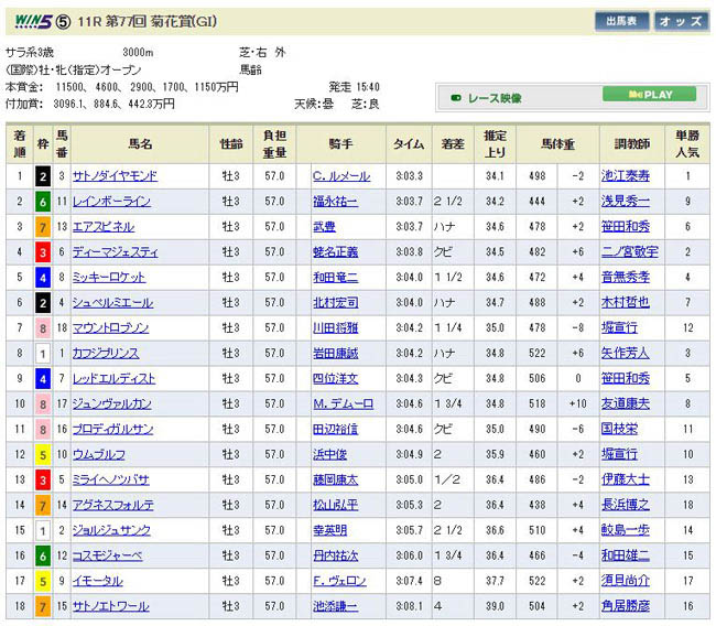 3歳牡馬クラシックロードの最終章は、皐月賞馬ディーマジェスティと、ダービー僅差2着馬のサトノダイヤモンドの一騎討ちモード。そこに神戸新聞杯でサトノダイヤモンドに迫ったミッキーロケットとレッドエルディスト、更に逃げ粘ったカフジプリンスが3・4・5番人気と、やはり神戸新聞杯組が人気上位となっています。